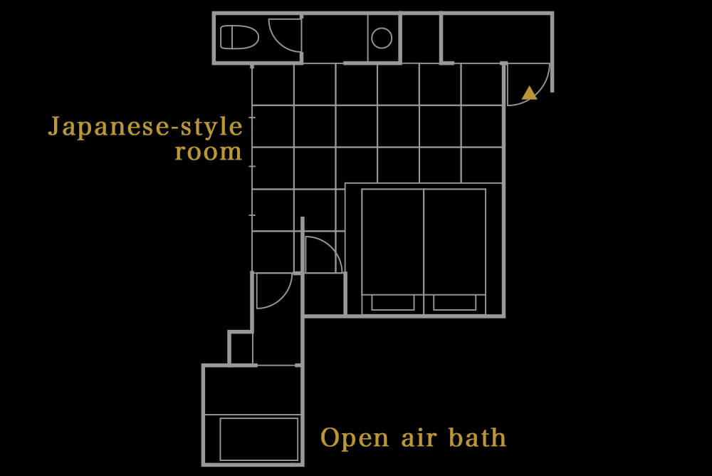 Open-air bath of Japanese cypress, 12 tatami mats of Japanese style room This room is for two people and is limited to one couple per day. The fresh mountain breeze blows comfortably into the open-air baths where the water from the private spring is poured out. Relax in the 12-mat "Japanese room" that combines the functional beauty of a hotel with the taste of a ryokan.