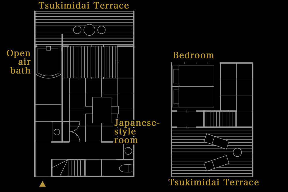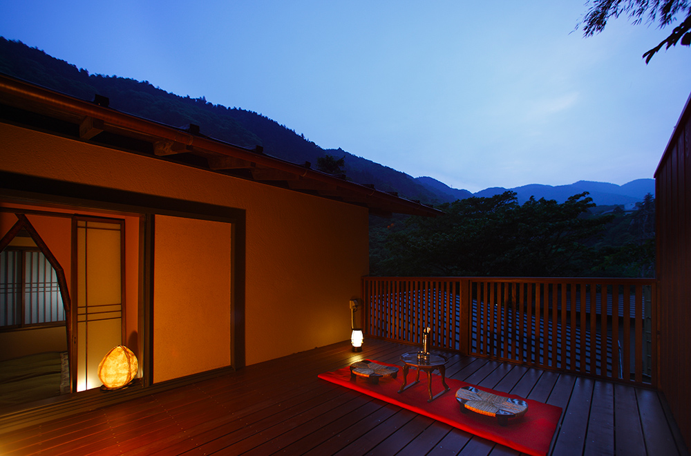 Special room with two-story open-air bath The private open-air bath, with a fresh mountain breeze blowing in, is made of washed out southern gravel. The bath tub is spacious enough for two people to relax in. An eight-mat Japanese-style room connected to a six-mat open moon viewing platform. On the upper floor, there is a bedroom with a relaxing atmosphere. This is a luxurious maisonette-style special room with a moon viewing platform on the first and second floors, where you can enjoy the view of the mountains and the quiet moonlit night.